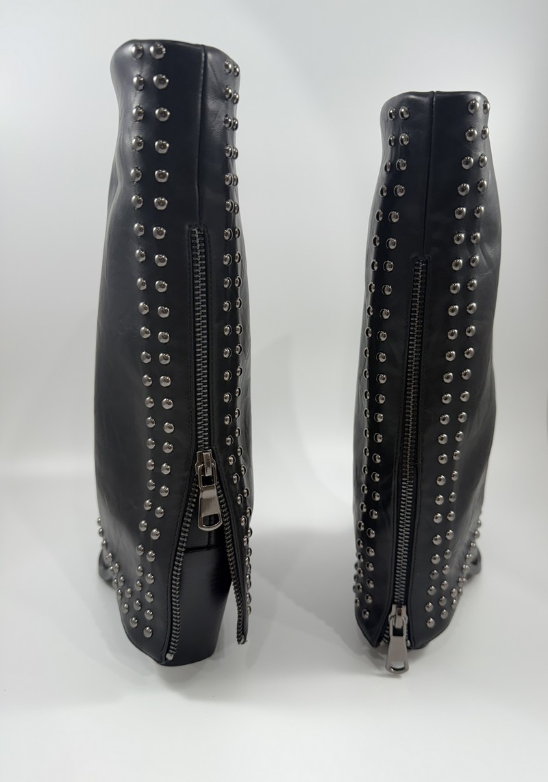 La zip posterioree la doppia fila di borchie metalliche lungo il gambale svasato,
