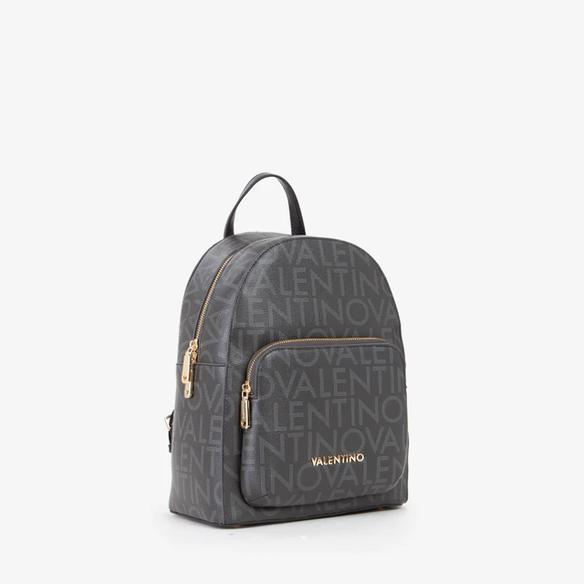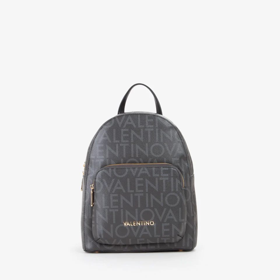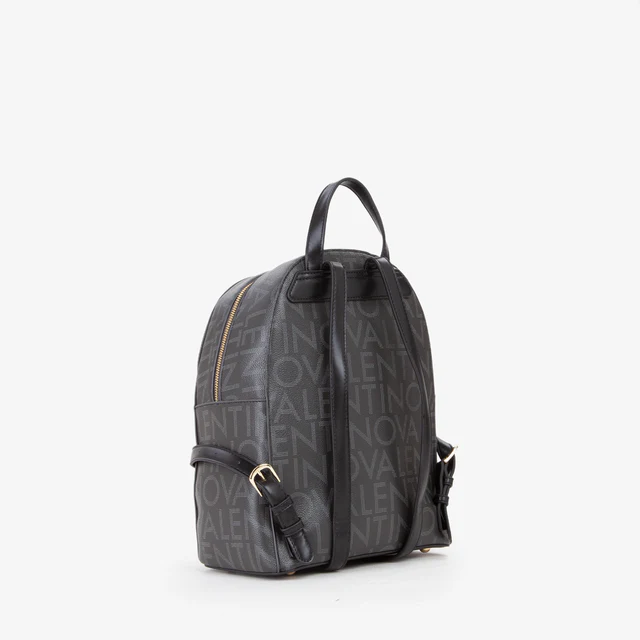 zaino dalle medie dimensioni con stampa all over logato su base grana riciclata, e dettagli in nappa , tracolla a nastro con logo jaquard in tono.
